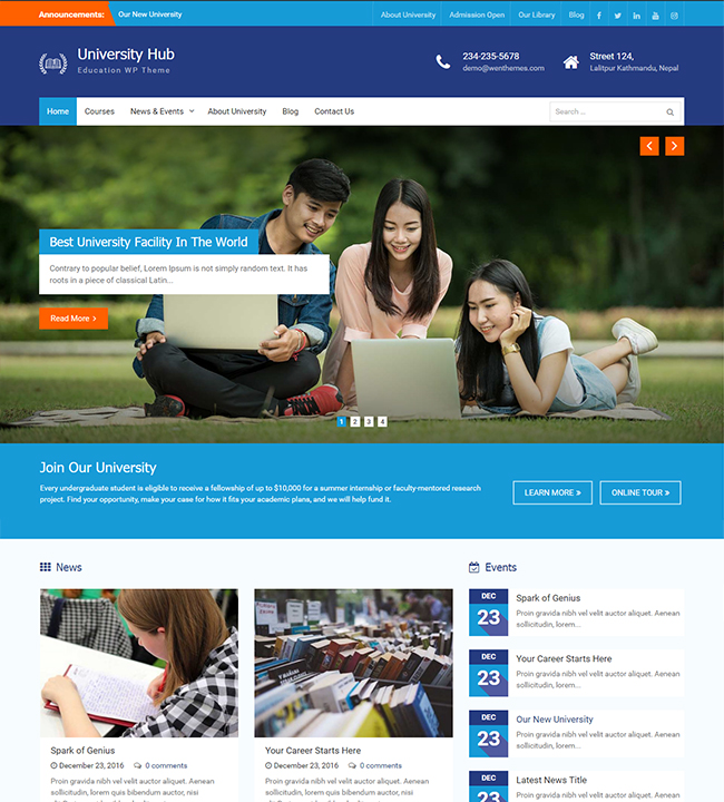 University Hub, an Education theme by WEN Themes, is a responsive WordPress theme for university, school, college or other educational institutions. Along with educational institutions, University Hub is flexible and loaded with several features to also cater to the needs of design agencies, corporate websites and small businesses.