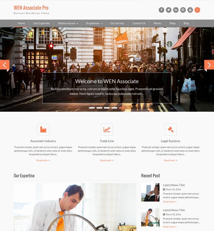 WEN Themes proudly presents WEN Associate Pro : as an ode to own affiliation with esteemed Associates. Simplicity – as we practice – is upheld with this general-purpose responsive theme with amass of pluggable sections. A must-have for any Associate-, Corporate- or Business-motive oriented showcasing. Based on the evolving in-house responsive starter theme, options are a-many. Code quality, many hooks, convenient Customizer settings, multiple guided sections – all make up to a responsive, easy-to-use theme. Multiple header layout, responsive menu and slider, standard sections, featured content, footer widgets and an overall sturdy package to install and deploy. This could be the next closest theme to setting up a perfect Corporate website for your usable purpose. Official Support Forum: http://themepalace.com/support-forum/ Full Demo: http://demo.wenthemes.com/wen-associate-pro/