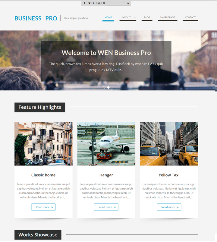 WEN Themes proudly presents WEN Business Pro ( extended version of WEN Business ) : a spacious , generous , Corporate theme that offers convenience to anyone setting up the theme . Simplicity and roomy sections , all well-knit to deliver an exceptionally personal , professional or private showcase . Powering the build , is the in-house responsive framework that offers features that suffice a lot of needs and that is convenient to operate upon as well . This time its a one-layout header , clean menu , slider , focused content , pretty effects , portfolio showcasing , testimonials , neat footer all following fully responsive patters . The code / setup is easy to customize and extend by various hooks offered in the build – those that help any technical person add further extensions on the base of an awesome build . This is a theme that works toward simplicity in setup , ease in use .