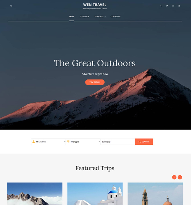 WEN Travel is a responsive Travel WordPress theme with an abundance of expressive travel features and functionalities. The theme is ideal for all travel-related businesses and blogs like Travel Agencies, Travel Blogs, Travel journal, and Tourism Websites. The modern design is fully responsive and excellent to attract potential customers. A vast range of features has been power-packed into WEN Travel, making it a perfect theme to suit all travel businesses. WEN Travel is fully compatible with WP Travel Plugin, a popular travel WordPress plugin. In order to get Trip Filter and sections like Latest Trip and Destinations, you can activate the WP Travel WordPress Plugin. The theme comes with features like Gallery section with fluid design, Header Top Option, Portfolio section with Trips Destination Filter, Promotion Headline with Video option, Hero Content, Logo Slider, Stats, Team, Testimonials, and more. All of the sections and features in WEN Travel are fully customizable and absolutely easy to use. So, if your goal is to create a successful Travel WordPress theme, WEN Travel is the one to go for! Moreover, one-click demo is also available to minimize your time on website customization. Official Support Forum: https://themepalace.com/support-forum/ Full Demo: https://wenthemes.com/theme-demos/?demo=wen-travel