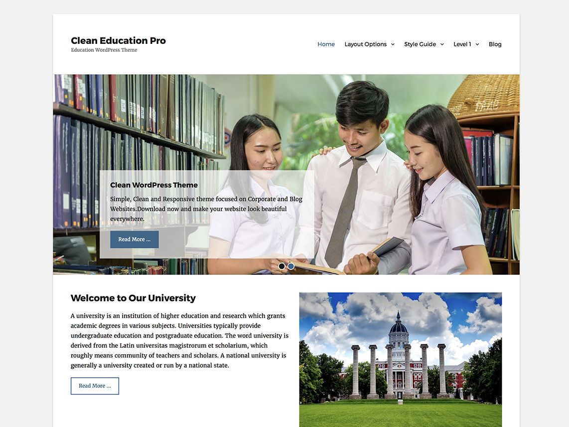 There are sections for courses, professors, recent news, events, and testimonials. Display your most impressive facilities and content on the forefront with the Featured and Hero Content sections. Clean Education Pro also comes with Advanced Color Options, WooCommerce, and WPML support.  Also, Clean Education Pro is translationready.