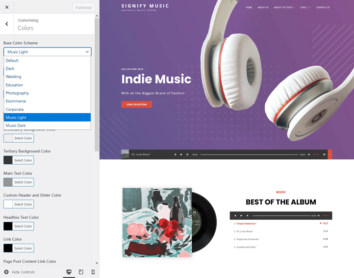 Under the Colors Option, you will now find the added Base Color Schemes for Music Light and Music Dark. The colors in different sections of your site vary from scheme to scheme. For instance, if you choose the Music Dark color scheme, your site will portray a visually aesthetic dark side with elegant and bold colors.