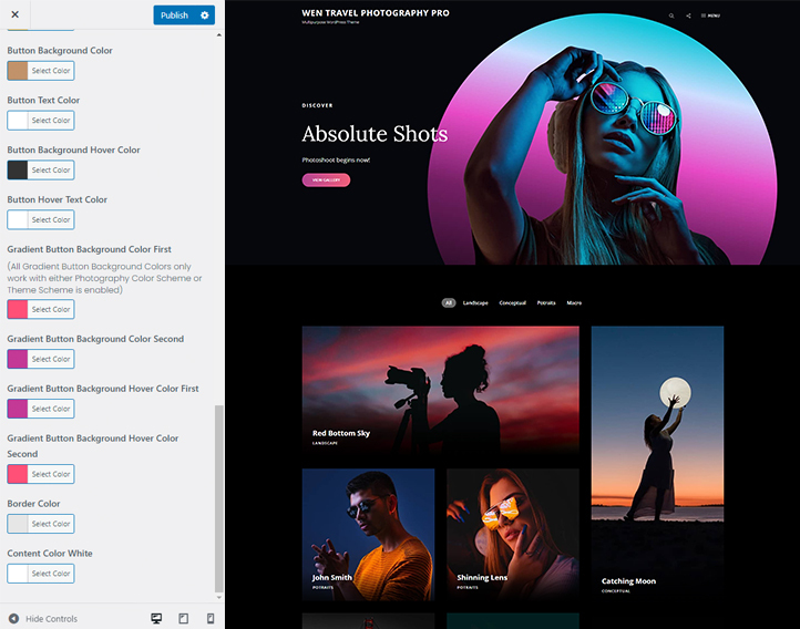 Under the Colors Option, you will now find the added Photography option in the Color Scheme. All of your base colors are selected in a way that fits a photography website. Your photography site will look extra elegant and sophisticated with the Photography Color Scheme activated.