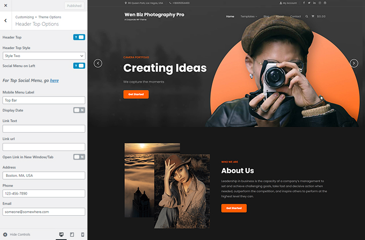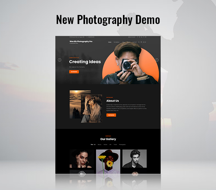 Furthermore, WEN Biz Pro 4.0 also comes with a brand new dark Photography demo with a modern and sophisticated design. You can import the demo with just a single click.