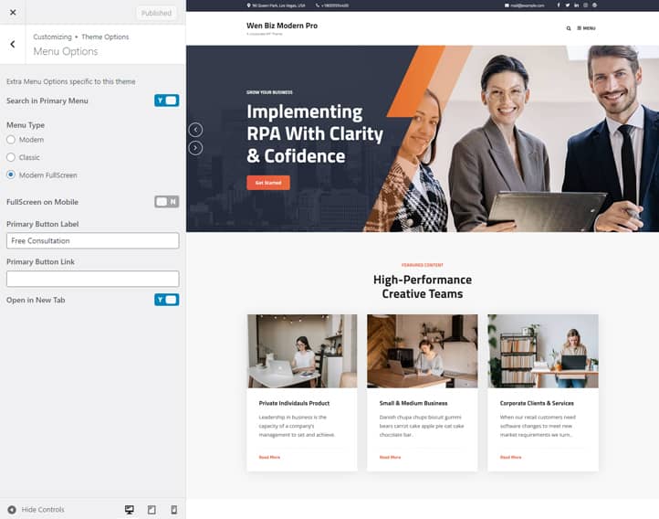 Giving it a fresh modern look, WEN Biz Pro now comes with a Modern Fullscreen Menu Type. Under the Menu Options in Customizer, you can choose a new Modern Fullscreen Menu Type along with Modern and Classic menu type. The Modern Fullscreen menu allows your hamburger menu to expand to full screen; giving it a modern touch.