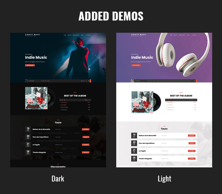 Signify Pro 3.8 now comes with two new one-click Music Demos – Signify Music Light and Signify Music Dark. You can import the Signify Music demos if you want to build your professional music site and promote your musical journey and music business.