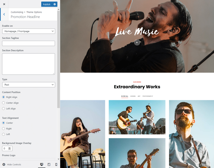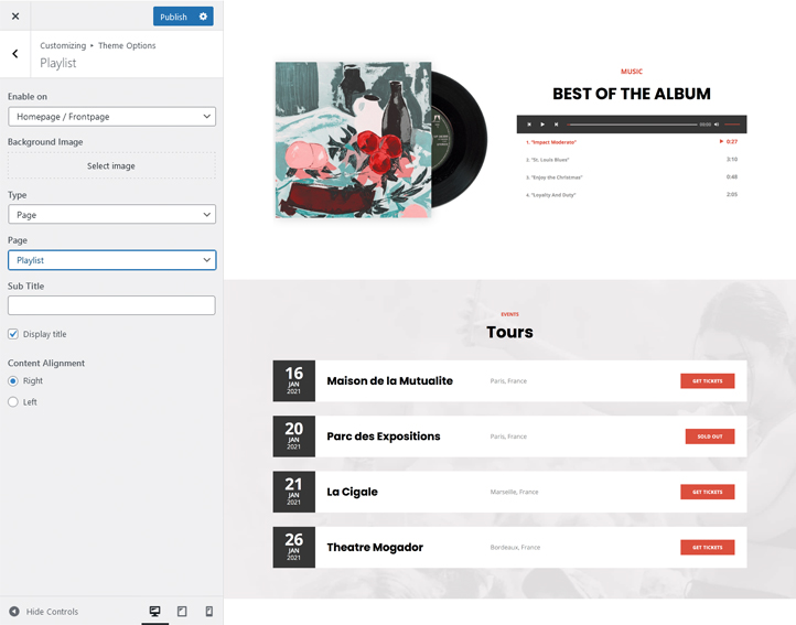You can now add the fresh tracks that you just released or anything that you want to showcase at large in the added Playlist section. You can display the playlist either on the Homepage or the entire website. You can also choose the playlist type from Post, Page, or Category. Also, choose how you want the content to be displayed. Add a nice set of songs that you want your audiences to check out at any cost. You can also add a background image to the Playlist section.