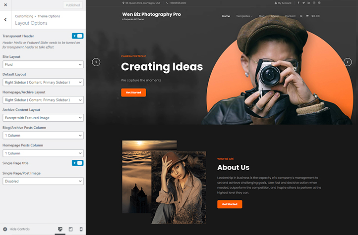 WEN Biz Pro 4.0 now comes with a new feature where you can make your header transparent and make your site more photography-ready with an interesting background. Under the Layout Options, you can enable the Transparent Header option. In order to make your header transparent, you need to first activate the Header Media option or the Featured Slider option.